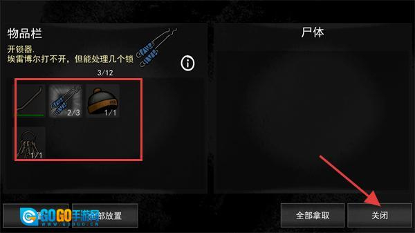 2、打开物品栏,查看已收集的道具(比如开锁器),确认好道具数量后点击“关闭”按钮,回到场景界面。