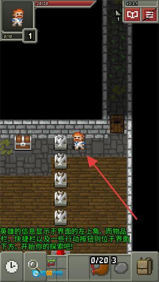 3、箭头指向场景里的白色怪物,物品栏位于界面下方,按照提示进行地牢探索。