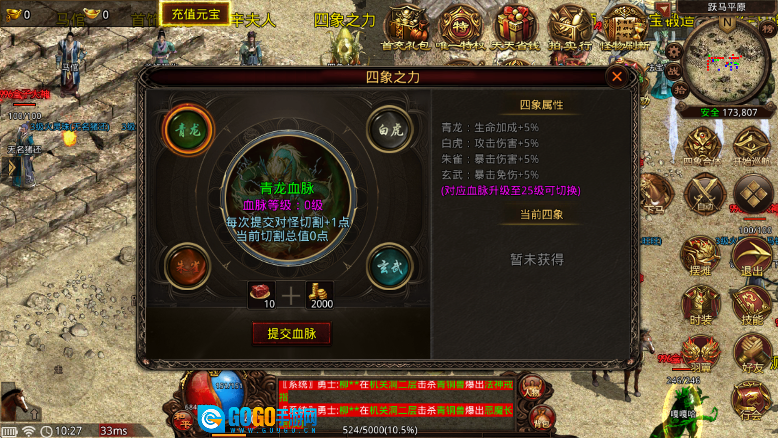 四象之力:消耗兽粮与金币就能提升青龙、朱雀、白虎、玄武这四种力量,每次提交材料都能使对怪切割增加1点,当对应血脉等级达到25级时可以进行切换。