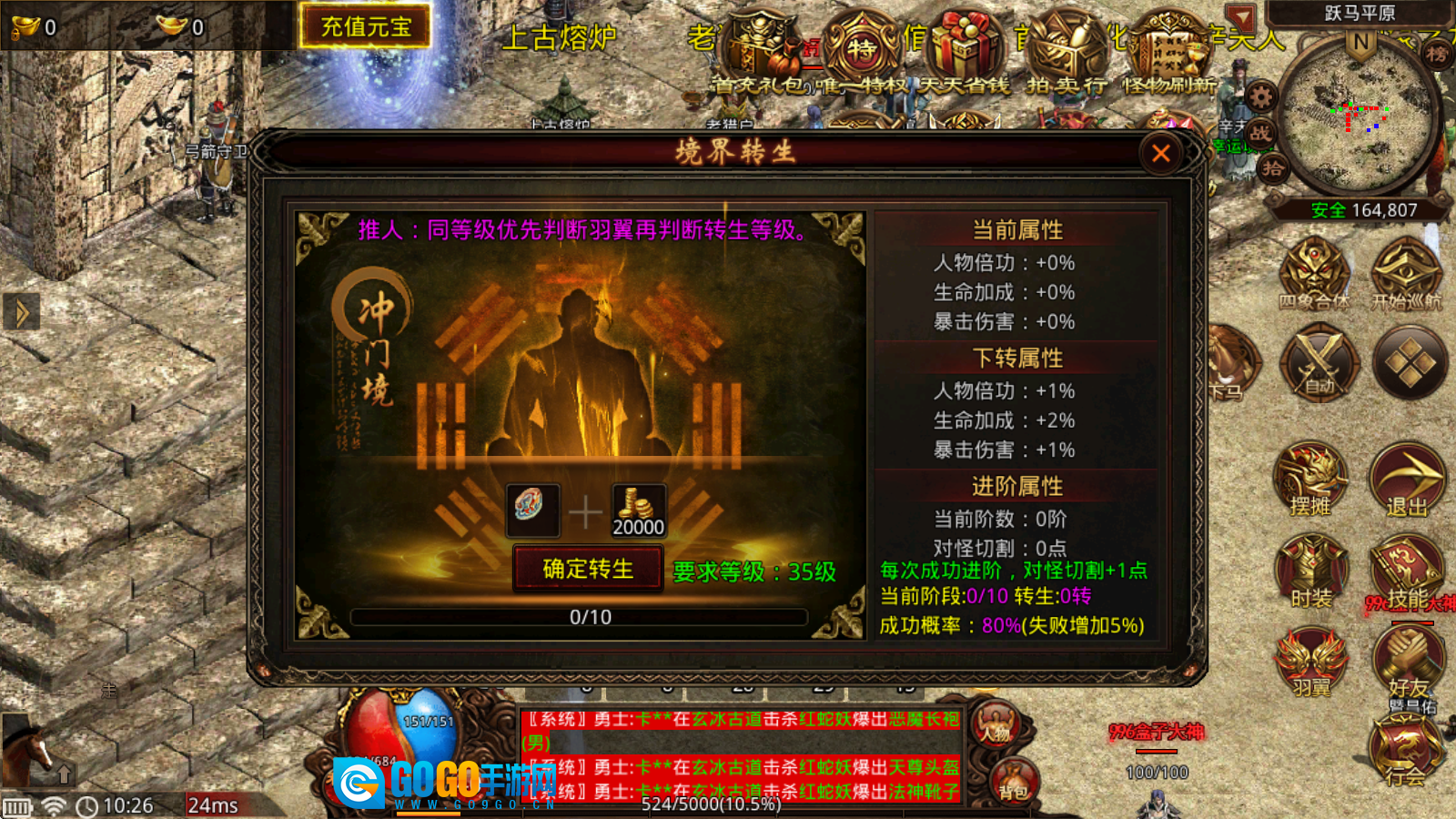 境界转生:当等级达到特定要求后,消耗金币与转生石就能完成转生。每次转生成功,对怪物的切割效果会增加1点,同时还能提升倍攻、暴击等属性。