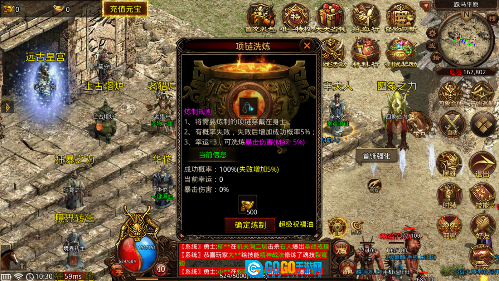 幸运项链:消耗元宝可炼制该项链,炼制过程存在失败几率,若失败则下次炼制的成功概率提升5%。该项链附带幸运+3属性,还能通过洗炼获得暴击伤害加成(最高+5%)。