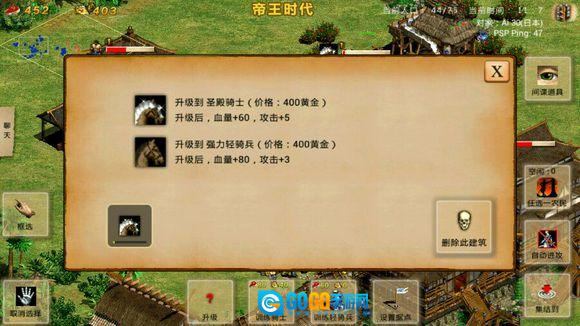 同样,我方在封建生产农民直到达到13~15人口时开始升级城堡时代。到达城堡时代后,选择金矿下方的住房。可以看见右下角有一个骷髅头标志的“删除”,点击后住房自爆,采金农民出去在外面图示位置建立城堡。