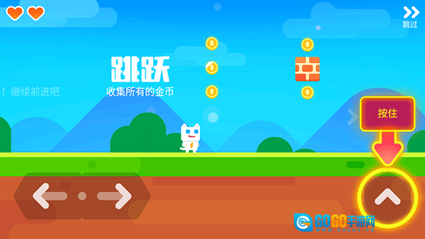2、遇见金币时,按住右边向上箭头跳跃将金币手机起来