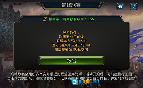 巅峰联赛会随机安排多支满足报名要求、实力相当的联盟彼此对战。活动启动后,各联盟可前往目标王国攻击对方部队来获取联赛积分,最终将依据联盟在活动结束时的积分排名,发放相应的丰厚奖励。