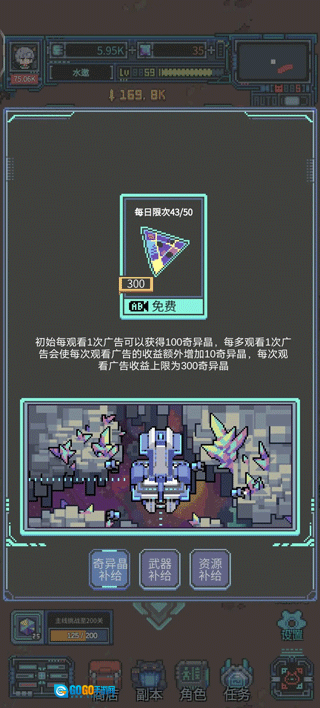 首先是概率极低的保底武器池,我的建议是摸一把光剑就够了(主要是颜值高),石头优先用来买服装,先把加暴击率的服装入手,这样人物基础暴击率大概能到25左右,再加上装备升级、武器词条这些,很容易就能做到刀刀暴击(毕竟暴击伤害起来之后,不暴击真的太难受了)。至于我到500层才想起需要暴击这件事,只能说真的痛苦……之后就靠刷广告攒资源,在武器和服装之间反复购买调整就好。