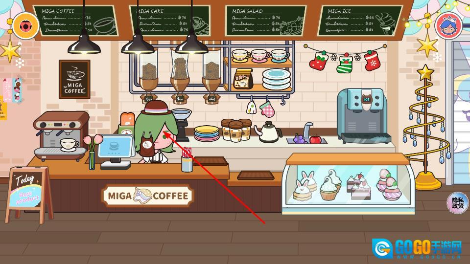 走进标有MIGA COFFEE标识的咖啡店,你可以操控那位绿头发的店员角色,在吧台前操作咖啡机制作咖啡,还能摆放圣诞袜、螺旋圣诞树之类的装饰,全身心沉浸在店铺经营的整个流程里。