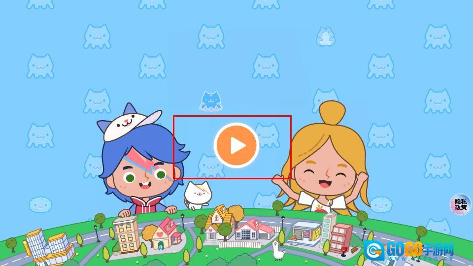 点击启动界面正中央那个橙色的播放按钮,就能进入米加小镇的世界啦——这里以蓝色为底色,到处都布满了可爱的猫咪图案。画面里,两个卡通角色和迷你城镇模型相互映衬,一场充满创意的互动体验之旅也就此正式开启。