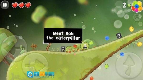 1. 这是一款画面风格卡通可爱的横版卷轴动作闯关游戏,主角是一只决心拯救公主的绿色毛毛虫。