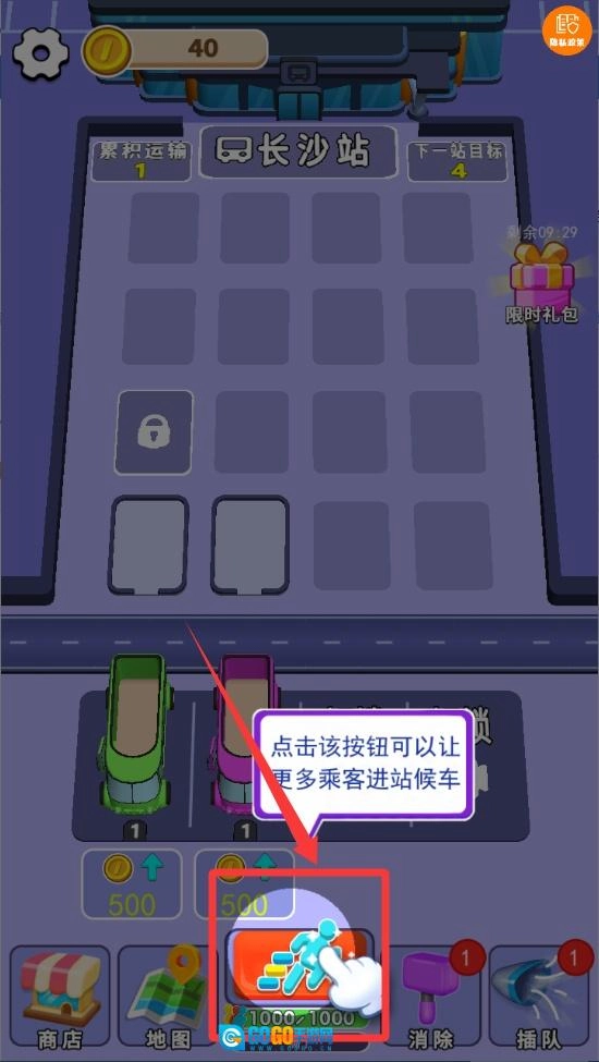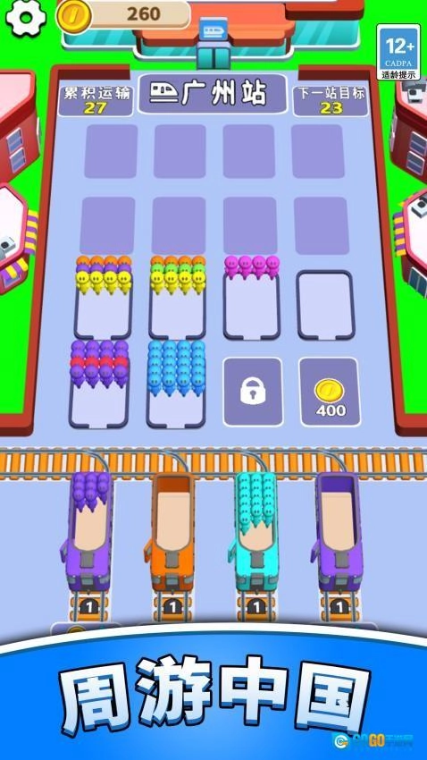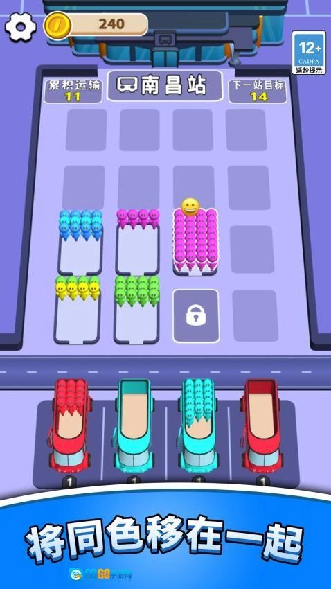 屏幕底部会不断生成新的乘客,这些乘客用不同颜色来区分,会从右往左依次排队出现,每个乘客头顶都显示着对应的颜色标识。