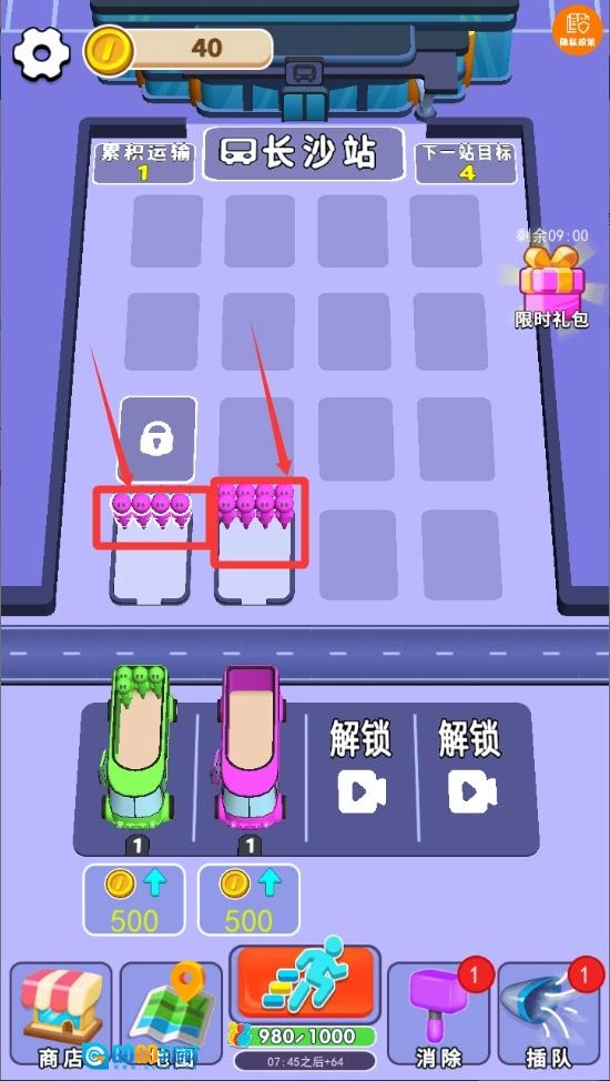 游戏的核心玩法是匹配相同颜色的乘客,点击相邻的同色乘客就能完成配对,配对成功的乘客会手拉手组成组合。