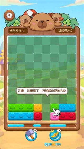 游戏开始时跟着新手引导熟悉基础操作,通过移动或旋转方块来填满横向的格子,以此完成消除。