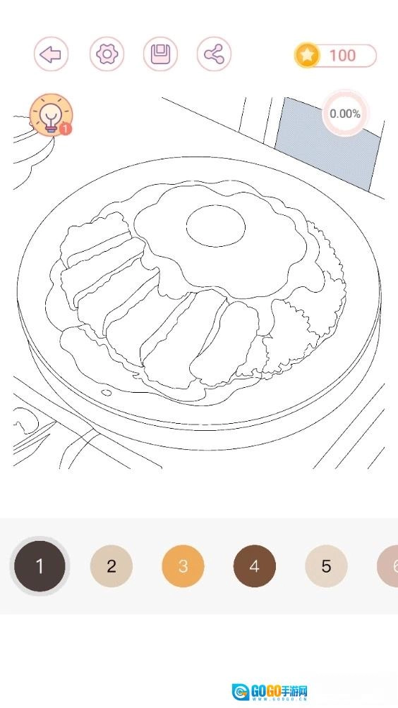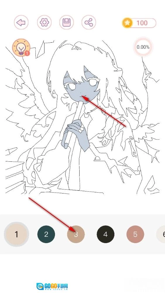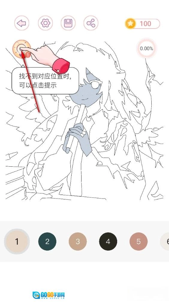 3、根据提示进行涂色操作,点击颜料后,图片上会呈现出待涂色的区域。