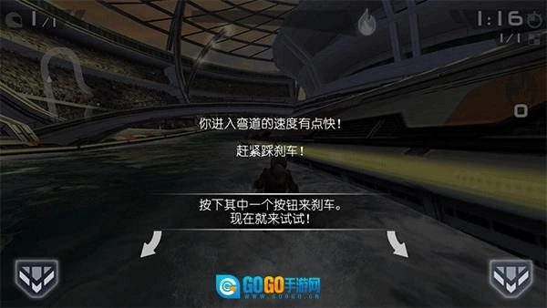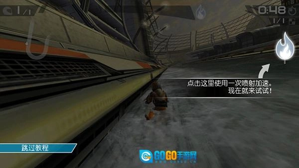 汽艇会自动加速,玩家只需借助重力传感器操控左右方向的变动。只要触摸屏幕底部两个向下箭头中的任意一个,就能让摩托艇刹车。能量值会显示在屏幕上方的正中间位置。当积累到足够能量时,可点击屏幕右侧的火焰按钮,从而获得强劲的加速效果。