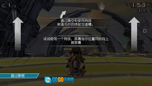 每条赛道都设有不少高平台和水面落差明显的路段。当你借助高平台或水面起伏腾空而起时,就能尽情展示特技了。只要用两根手指分别在屏幕左下角和右下角滑动,就能做出五花八门的动作。游戏里有好几十种不同的特技呢。