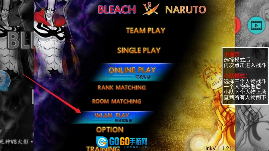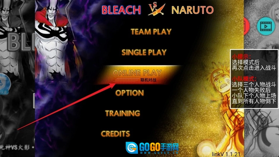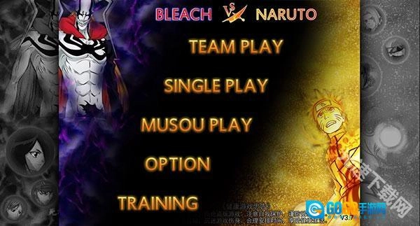 打开《死神vs火影》,进入玩法模式选择界面,这里有小队模式TEAM PLAY、单人模式SINGLE PLAY以及无双模式MUSOU PLAY可供选择。