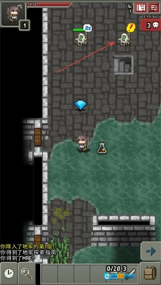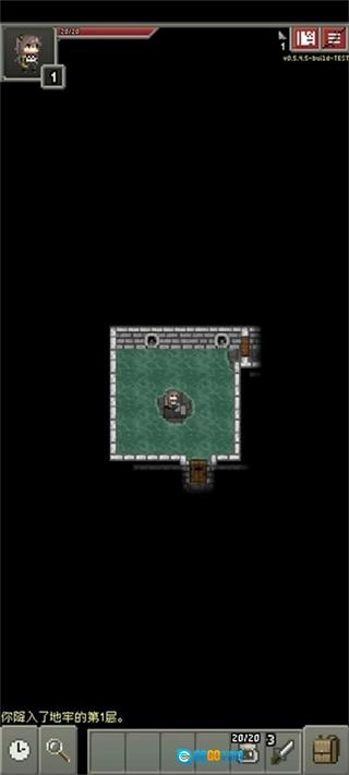 进入地牢后,左下角的信息框会显示你已踏入地牢第1层,留意地图里的怪物,一旦惊动它们就会出现感叹号标识。