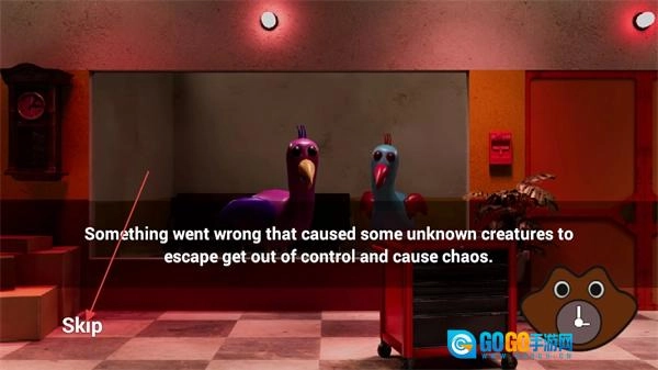 这是游戏的开场剧情界面,界面文字介绍了未知生物失控逃脱并造成混乱的背景设定,点击左下角的Skip按钮可以跳过这段剧情,直接进入游戏流程。