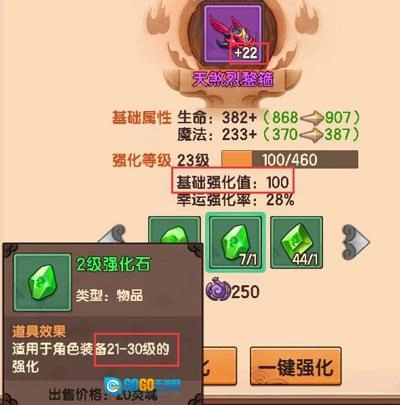 当装备强化等级达到22级时,继续使用1级强化石,每次只能获得10点强化值,这样的性价比是比较低的。