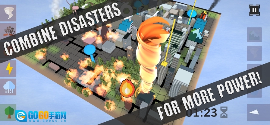 非自然灾害(英文名Unnatural Disaster)是一款能借助自然力量破坏一切的休闲解压游戏。玩家可直接挑战高难度关卡,只要灵活运用陨石、龙卷风等自然之力,就能摧毁关卡内的所有场景,但要留意导弹、水罐车等阻碍物的出现。