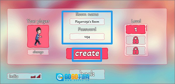4、接着设置房间名称、密码和等级,之后点击create按钮