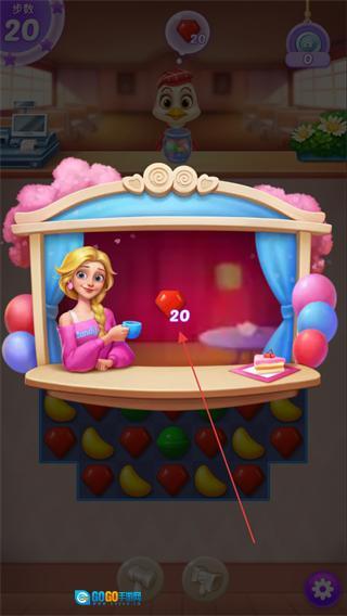 1、明确关卡目标是收集20颗红宝石,进入棋盘后要优先消除红色爱心糖果,以此快速积累红宝石的数量。