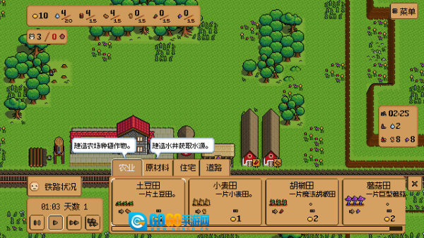 钢铁之村是一款像素卡通风格的模拟经营游戏。玩家将置身于工业革命初期,从一片荒芜之地开始发展:先开垦农田种植作物积累初始资金,借助基础铁路运输作物获取收益;随着财富增长,可解锁更多产业推动整体发展,同时拓展铁路线路扩大销售,进一步提升盈利能力。游戏从基础农业起步,玩家需逐步解锁高阶工业以提高利润,建造各类建筑与工厂产线、构建完整产业链后,就能开启炼钢挑战赚取巨额资金,轻松打造繁荣的工业重镇——过程中还会触发各类随机事件。