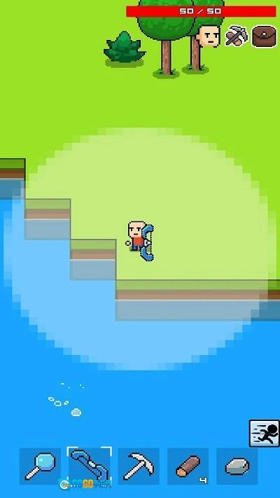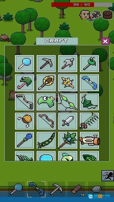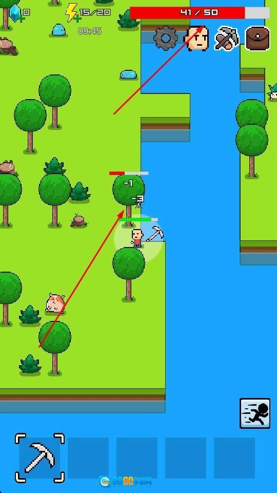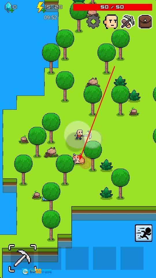 在游戏进行时,你需要控制角色移动,当遇到粉色怪物时要主动发起攻击,同时注意观察顶部显示的血量(比如50/50这样的形式)以及能量闪电标识的变化情况。另外,记得点击树木,并用斧头进行砍伐来获取所需的资源。