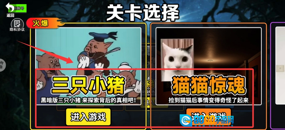 可以从两个主题关卡里挑选,一个是"三只小猪",另一个是"猫猫惊魂",每个场景中都藏着让人毛骨悚然的隐藏剧情。