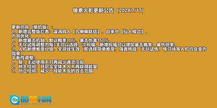1、新增完整版忍者:漩涡鸣人【九喇嘛联结】、自来也【仙人模式】。