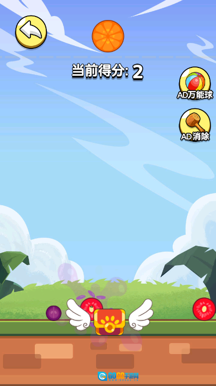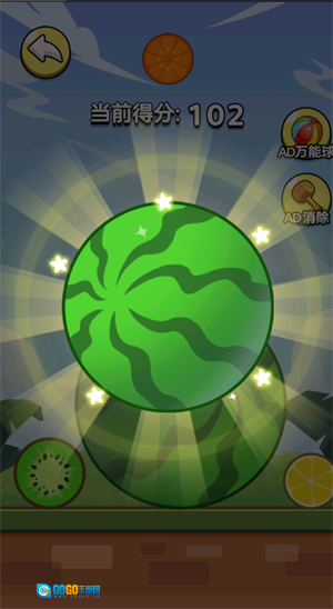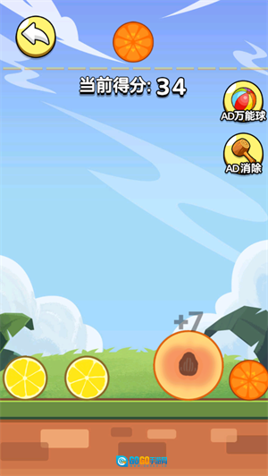 2、把两个相同的水果合并到一起,就能升级成更高级别的水果