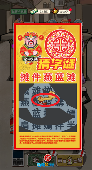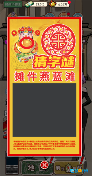 1、点击地面上的字谜即可开启猜字谜活动,接着点击左侧的财神元宝,持续点击该元宝,就能触发隐藏的彩蛋