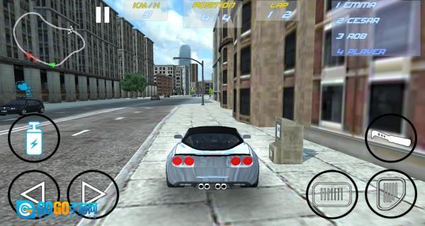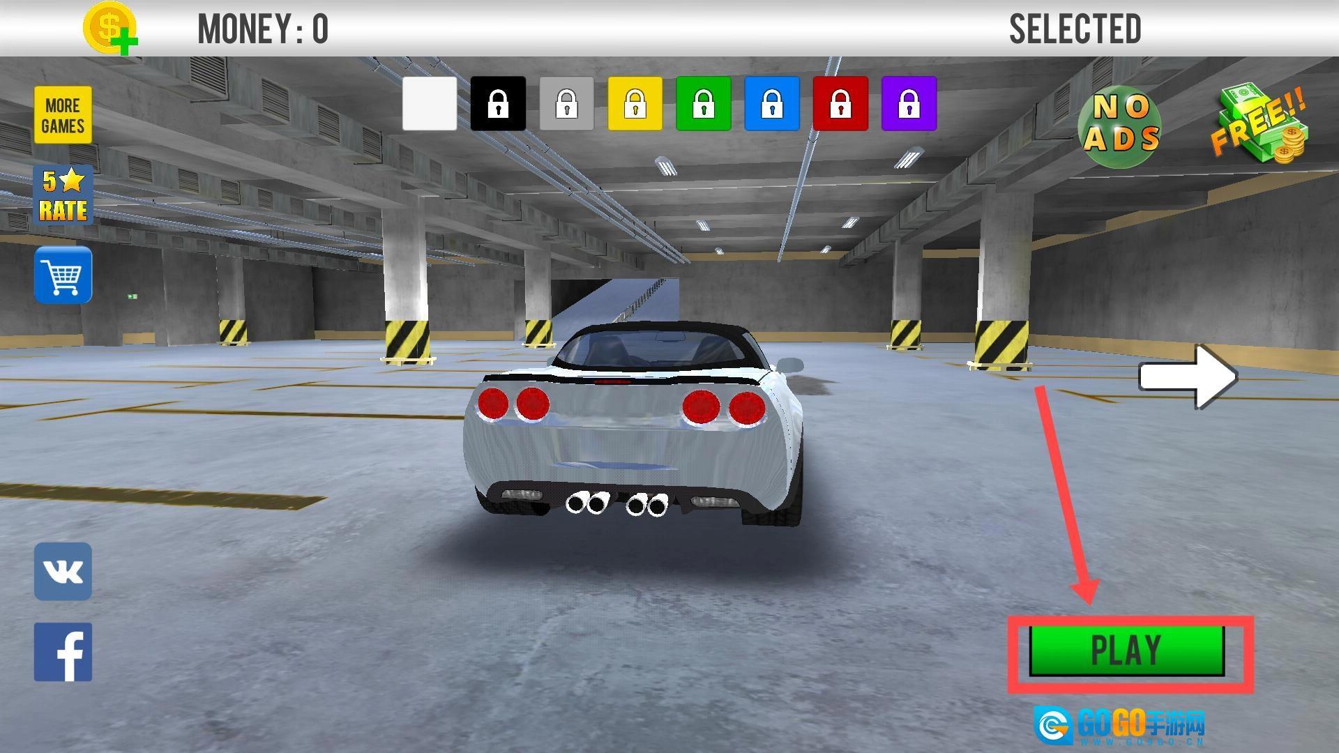 玩家点击绿色的PLAY按钮,选择银色跑车开启游戏,进入赛车竞技模式,准备在赛道上展开竞速。