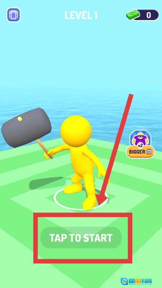 进入第一关的界面后,角色会手持大锤站立着,此时点击下方的启动按钮,就能开启关卡挑战了。