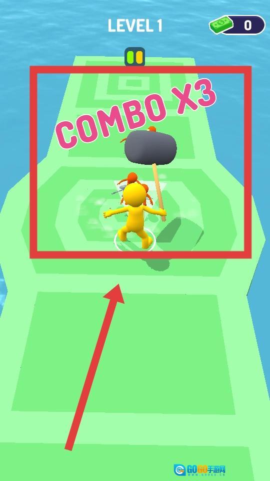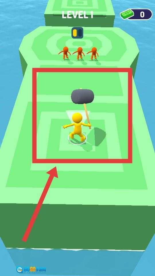 角色顺着绿色跑道向前行进,途中遇到前方的橙色小人,玩家需要操控角色移动,使用大锤攻击来阻拦这些敌人。