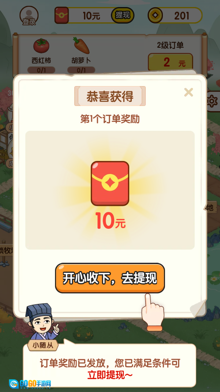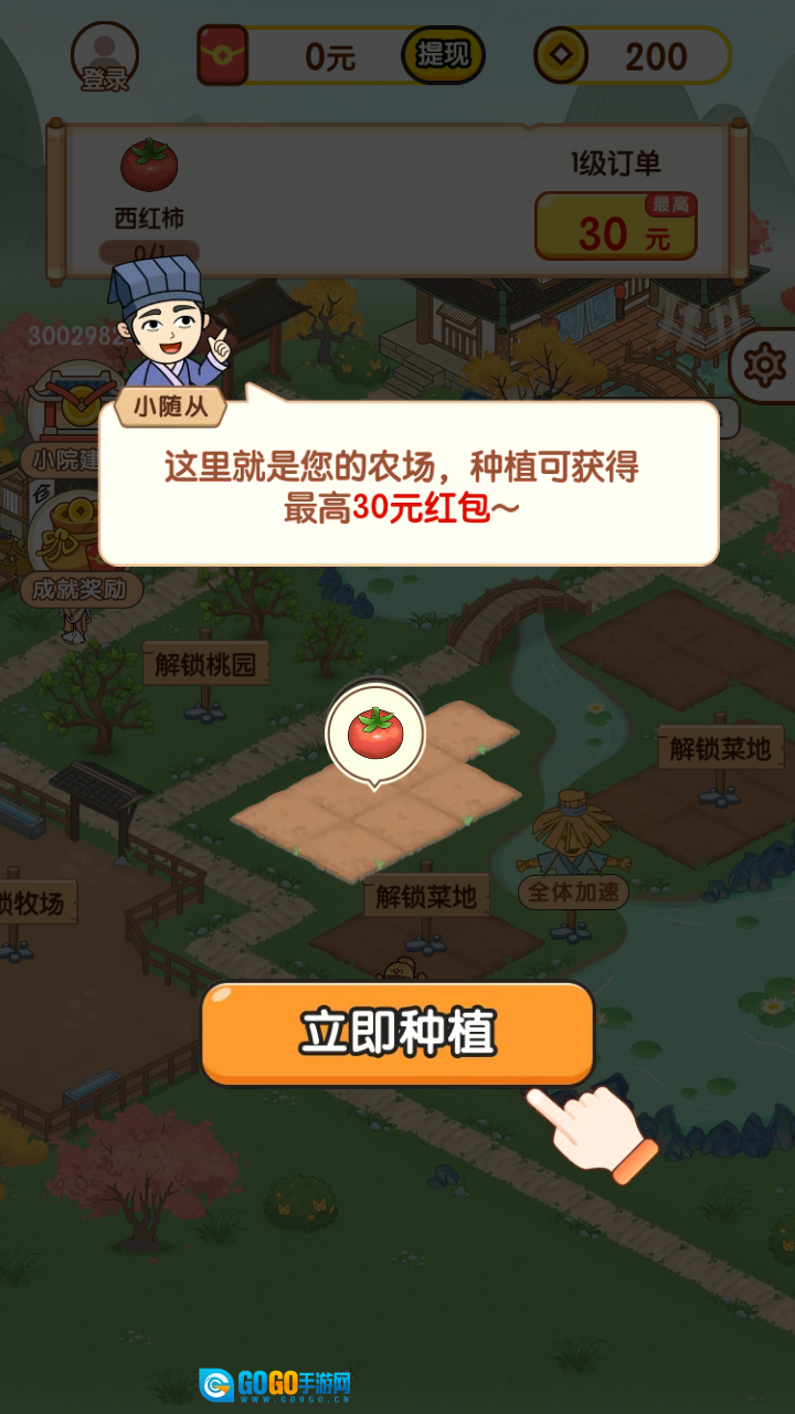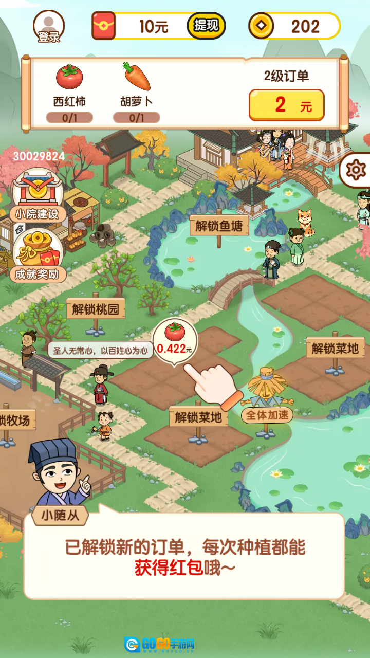 田园梦耕是一款全新上线的古风种植小游戏。玩家可以通过种植农作物来完成订单,以此获取相应的红包奖励。只要多多种植,就能完成更多任务,随之而来的福利也十分丰厚,这些奖励都可以累计起来,当达到一定金额时就能进行提现。