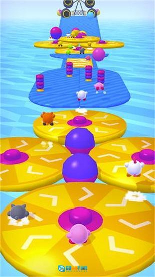 当遇到前方的障碍物时,快速点击右侧的射击按钮发射糖豆,精准命中目标能够获取额外积分,最先冲过终点线的一方就能赢得比赛的胜利。