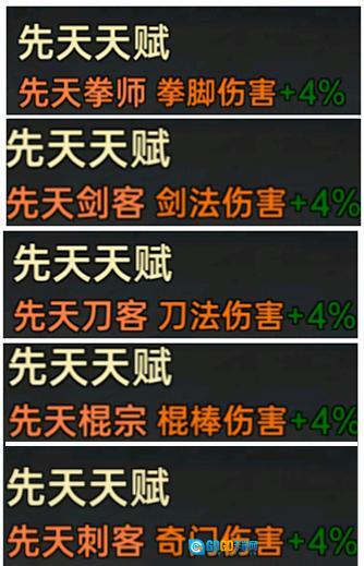 主角的职业发展方向可依据先天天赋来确定,这款游戏总共有20种先天天赋。先天天赋会随机抽取一条,且随机次数没有限制,玩家可以自主进行选择。选择拳系玩法就选先天拳师,选择刀系玩法就选先天刀客,选择剑系玩法就选先天剑客,选择棍系玩法就选先天棍宗,选择奇门玩法就选先天刺客,这类天赋能带来4%的伤害加成。