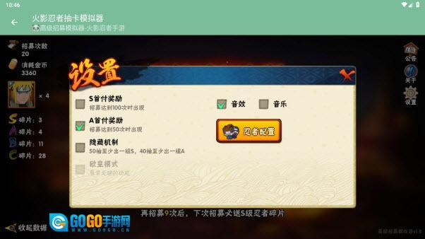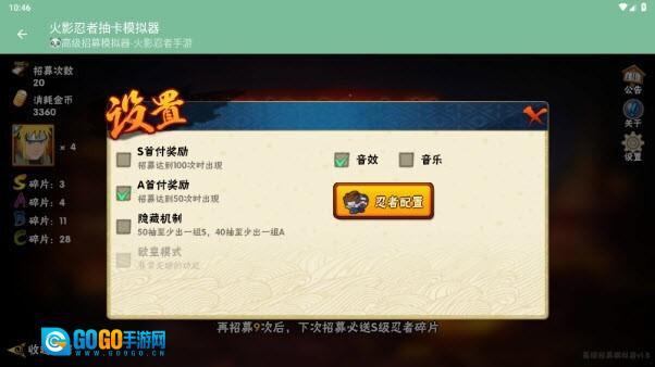 设置里的“忍者配置”选项能确保我们百分百招募到选定的忍者碎片。