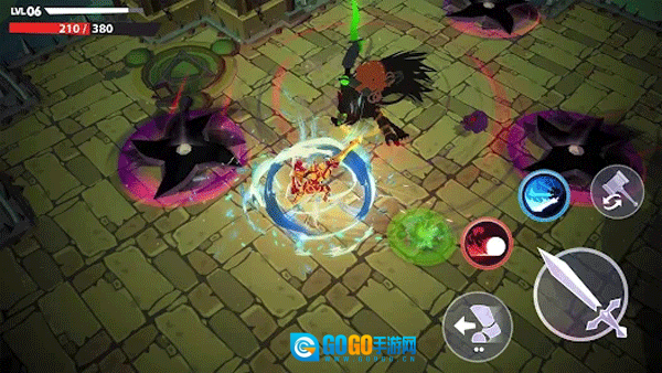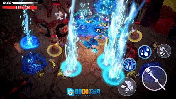 当面对成群敌人时,释放强力技能是关键操作,点击蓝色圆圈内的按钮即可发动范围性攻击。