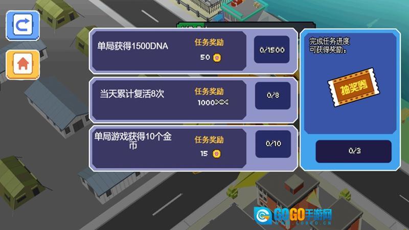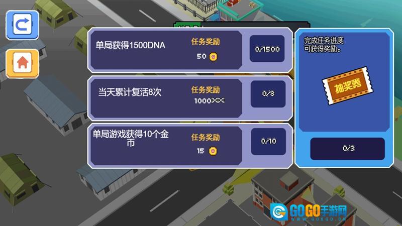 每局结束后查看破坏情况,依据获得的属性、金币等,完成任务领取奖励,使用抽奖券解锁新怪兽或道具。