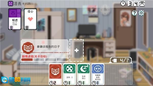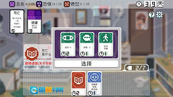 左上角的状态卡,每天会从左向右自动启动一次,要么增加负面情绪,要么清除对应的卡牌。