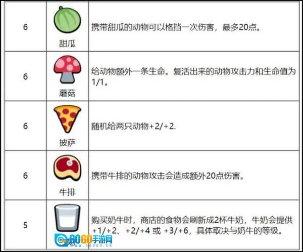 Cow/奶牛(4/6): 购买效果:将食物商店替换为2份免费牛奶,每份牛奶可为一个随从提供+1/2/3攻击力与+2/4/6生命值加成。