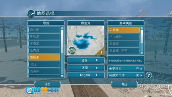 之后我们可以选择森林湖(里面有河鲈、梭鲈)或者麋鹿湖(里面有河鲈、白鲑),游戏类型总重量(千万不要和电脑比数量),游戏时长设置为10分钟,其他选项保持默认,通过这种方式快速积攒金币。