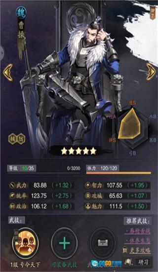 曹操的定位是辅助防御型角色,其专属武技为“号令天下”,该武技具备保护友军以及提升友军伤害的效果。当曹操担任主将时,还能够提升自身的防御能力,并降低敌军的伤害输出。在武技搭配方面,推荐选择唇枪舌战、休养生息与遁甲天书。