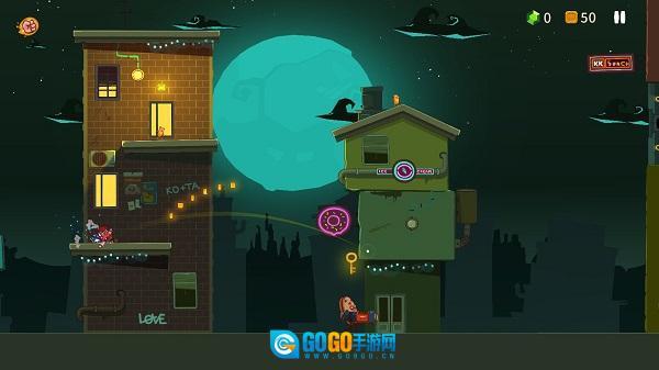 玩家基本上只需一根手指就能完成操作,游戏里没有上下左右的方向键,也没有跳跃键。拖动主角时会出现一条抛物线,这时你会进入“子弹时间”状态,周围的动态会变得非常缓慢。松开手指后,主角就会沿着抛物线的轨迹弹射出去,并且能够粘在任何物体表面。