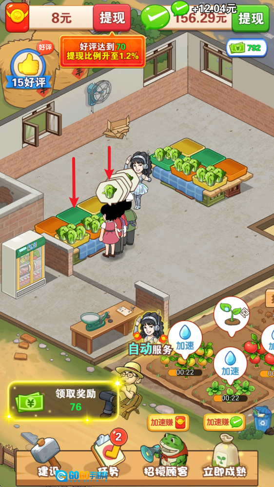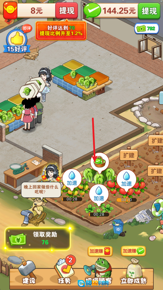 3、收获后的货源会被投放到菜市场里,点击客人头顶的图案就能完成销售。