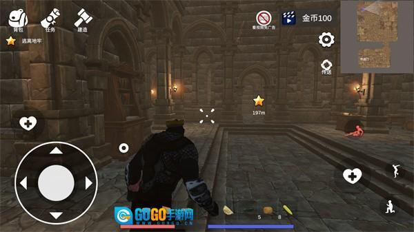 3、返回主界面后,点击“开始游戏”即可进入游玩环节。左下角的移动摇杆用于操控角色移动,右下角的按键则负责战斗相关操作,正下方的区域显示人物状态栏,右上方的地图能帮助你了解角色当前所处的位置,左上方的背包功能支持将暂时不需要的物品存入仓库进行保存。