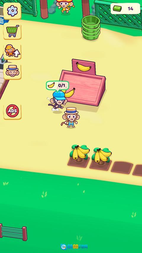 1、启动猴子超市游戏,该游戏运用横版滑屏的操作方式,玩家首先要操控猴子搭建收银台;