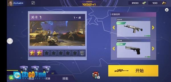 1、打开游戏后,先选好对应的关卡与枪支,再点击开始按钮,就能进入游戏游玩了。