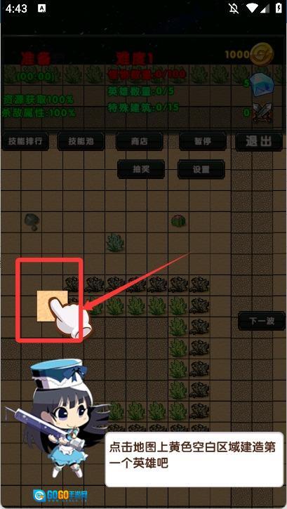 3、开始挑战后,点击地图上黄色的空白区域来建造第一个英雄吧。